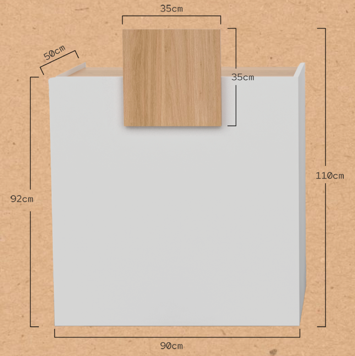 Empfangsschrank für Schönheitssalons, Friseure und Barbiere. Die Struktur der Möbel besteht aus hochdichtem Holz, ist mit einer Melaminplatte mit verschiedenen Effekten versehen und verfügt über PVC-Kanten, die für eine perfekte Abdichtung mit Polyurethankleber überzogen sind. Oberes Regal und dekorative erhöhte Frontplatte in verschiedenen Farben. Der Innenraum ist so gestaltet, dass er den Stauraum auf intelligente Weise maximiert.